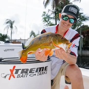 Johnny guides on the weekends/ 3 days a week and captains a private boat during the week. He uses a 20-gallon X-Treme Bait Tank for Florida ThreadFin Shad. Fishing the Florida canals for snakehead, Peacock Bass, Oscar, Clown Knifefish and more. Tarpon and other saltwater fish from the Miami Bay area. Johnny also keeps a 65-gallon X-Treme Bait Tank at his home that he uses as a holding tank for shrimp and will take to tournaments as a CPR tank holding up to 12 or more 3+lb Peacock Bass before they are returned back to the lake.